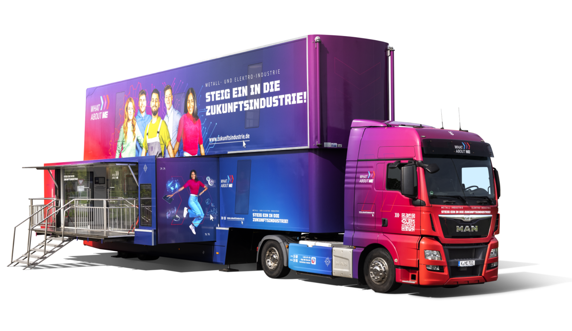 Der M+E-InfoTruck informiert erlebnisorientiert über die Ausbildungsmöglichkeiten und Berufsbilder in der Metall- und Elektro-Industrie. An anschaulichen Experimentierstationen erleben Jugendliche die „Faszination Technik“ – praxisnah und intuitiv.